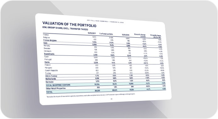 2017 FULL-YEAR EARNINGS — FEBRUARY 8, 2018 VALUATION OF THE PORTFOLIO (€M, GROUP SHARE, EXCL. TRANSFER TAXES) 12/31/2017 % of total portfolio 12/31/2016 12-month change 12-month change Current Like-for-like1 France 7,073 34.9% 6,880 +2.8% +1.9% Belgium 432 2.1% 385 +12.1% +11.2% France-Belgium 7,504 37.0% 7,265 +3.3% +2.4% Italy 3,900 19.3% 3,665 +6.4% +6.9% Norway 819 4.0% 895 -8.5% +4.5% Sweden 726 3.6% 738 -1.6% +4.8% Denmark 638 3.2% 616 +3.7% +3.6% Scandinavia 2,183 10.8% 2,249 -2.9% +4.3% Spain 1,870 9.2% 1,444 +29.4% +7.8% Portugal 389 1.9% 346 +12.3% +11.4% Iberia 2,258 11.1% 1,791 +26.1% +8.5% Poland 403 2.0% 423 -4.8% -5.2% Hungary 248 1.2% 227 +9.4% +12.9% Czech Republic 622 3.1% 509 +22.3% +16.6% Turkey 417 2.1% 540 -22.8% -5.5% CEE & Turkey 1,715 8.5% 1,732 -0.9% +3.8% Netherlands 1,330 6.6% 1,234 +7.8% +3.2% Germany 1,012 5.0% 1,021 -0.8% -5.1% TOTAL SHOPPING CENTERS 19,904 98.2% 18,956 +5.0% +3.9% Other Retail Properties 355 1.8% 399 -10.9% -2.5% TOTAL 20,259 100.0% 19,354 +4.7% +3.8% 1 Excludes the impact of new centers opened, acquisitions, asset sales completed since January 1, 2017 extension capex and foreign exchange impacts. 61