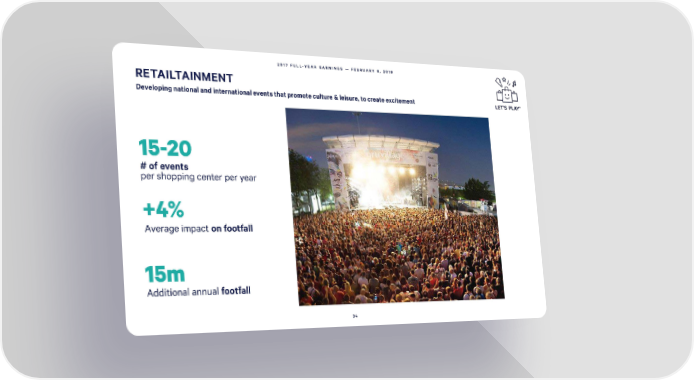 2017 FULL-YEAR EARNINGS — FEBRUARY 8, 2018 RETAILTAINMENT Developing national and international events that promote culture & leisure, to create excitement 15-20 # of events per shopping center per year +4% Average impact on footfall 15m Additional annual footfall 34