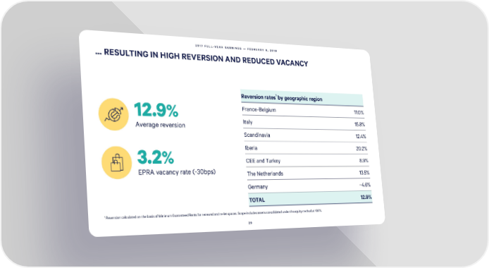 2017 FULL-YEAR EARNINGS — FEBRUARY 8, 2018 … RESULTING IN HIGH REVERSION AND REDUCED VACANCY Reversionrates1by geographicregion 12.9% France-Belgium 11.0% Average reversion Italy 15.8% Scandinavia 12.4% Iberia 20.2% 3.2% CEE and Turkey 8.9% EPRAvacancy rate (-30bps) The Netherlands 13.5% Germany −4.6% TOTAL 12.9% 1 Reversion calculated on the basis of Minimum Guaranteed Rents for renewed and re-let spaces. Scope includes assets consolidated under the equity method at 100%. 29