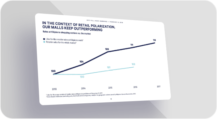 2017 FULL-YEAR EARNINGS — FEBRUARY 8, 2018 IN THE CONTEXT OF RETAIL POLARIZATION, OUR MALLS KEEP OUTPERFORMING Sales at Klépierre shopping centers vs. the market 113 Like-for-like retailer sales at Klépierre malls1 2 Retailer sales for the whole market 111 109 104 103 101 100 100 2013 2014 2015 2016 2017 1 Like-for-like scope consists of retailer sales in Klépierre’s portfolio as of December 31, 2017. 2 Store-based retail sales (excluding auto, fuel, food service and grocery retail) in the geographic markets served by Klépierre. Source: Euromonitor, ICSC. 15