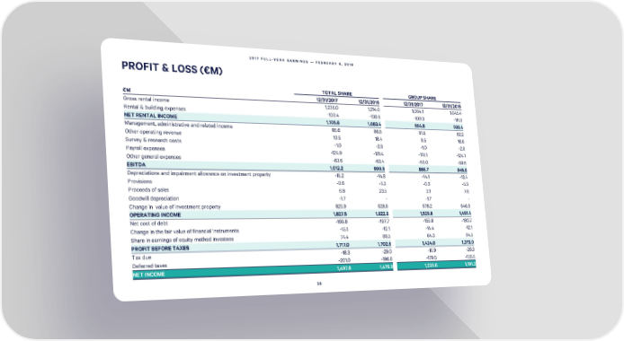 2017 FULL-YEAR EARNINGS — FEBRUARY 8, 2018 PROFIT & LOSS(€M) TOTAL SHARE GROUP SHARE €M 12/31/2017 12/31/2016 12/31/2017 12/31/2016 Gross rental income 1,236.0 1,214.0 1,064.1 1,045.4 Rental & building expenses -130.4 -130.6 -109.3 -111.9 NET RENTALINCOME 1,105.6 1,083.4 954.8 933.4 Management, administrative and related income 85.6 86.5 81.5 82.2 Other operating revenue 10.5 18.4 8.5 16.6 Survey & research costs -1.0 -2.8 -1.0 -2.8 Payroll expenses -124.9 -131.4 -118.1 -124.1 Other general expenses -63.6 -63.4 -60.0 -59.6 EBITDA 1,012.2 990.6 865.7 845.8 Depreciations and impairment allowance on investment property -15.2 -14.8 -14.1 -13.4 Provisions -0.6 -5.2 -0.3 -5.3 Proceeds of sales 6.8 23.5 2.1 7.8 Goodwill depreciation -1.7 - -1.7 - Change in value of investment property 825.9 828.8 678.2 646.6 OPERATING INCOME 1,827.5 1,822.8 1,529.8 1,481.4 Net cost of debt -169.8 -197.7 -155.8 -180.7 Change in the fair value of financial instruments -15.1 -12.1 -14.4 -12.1 Share in earnings of equity method investees 74.4 89.5 64.3 84.5 PROFIT BEFORE TAXES 1,717.0 1,702.6 1,424.0 1,373.0 Taxdue -18.3 -29.0 -15.9 -26.3 Deferred taxes -201.0 -196.6 -179.5 -155.5 NETINCOME 1,497.8 1,476.9 1,228.6 1,191.2 58