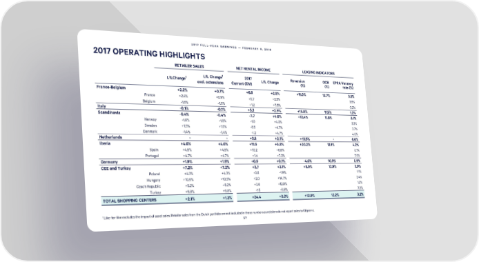 2017 FULL-YEAR EARNINGS — FEBRUARY 8, 2018 2017 OPERATING HIGHLIGHTS RETAILER SALES NET RENTALINCOME LEASING INDICATORS LfL Change1 2017 Reversion OCR EPRA Vacancy LfLChange1 LfL Change (%) (%) rate (%) excl. extensions Current (€M) France-Belgium +2.2% +0.7% +6.8 +2.5% +11.0% 12.7% 3.3% France +2.4% +0.9% +5.7 +2.3% 3.5% Belgium -1.6% -1.6% +1.2 +7.5% 0.2% Italy -0.1% -0.1% +5.3 +2.9% +15.8% 11.5% 1.2% Scandinavia -0.4% -0.4% -7.7 +4.6% +12.4% 11.5% 3.1% Norway -1.6% -1.6% -1.0 +4.3% 2.2% Sweden +1.5% +1.5% -5.5 +4.7% 3.7% Denmark -1.4% -1.4% -1.2 +4.7% 4.0% Netherlands - - +3.8 +2.1% +13.5% - 6.0% Iberia +4.6% +4.6% +11.6 +6.8% +20.2% 13.1% 4.2% Spain +4.5% +4.5% +10.2 +6.6% 3.1% Portugal +4.7% +4.7% +1.4 +7.3% 7.6% Germany +1.9% +1.9% +0.9 +0.1% -4.6% 10.9% 5.9% CEE and Turkey +7.2% +7.2% +3.7 +3.1% +8.9% 12.9% 3.9% Poland +4.3% +4.3% -0.6 -1.9% 1.1% Hungary +10.9% +10.9% +2.0 +14.7% 2.4% Czech Republic +5.2% +5.2% +3.6 +12.9% 1.2% Turkey +9.8% +9.8% -1.5 -6.9% 7.3% TOTAL SHOPPING CENTERS +2.1% +1.3% +24.4 +3.3% +12.9% 12.2% 3.2% 1 Like-for-like excludes the impact of asset sales. Retailer sales from the Dutch portfolio are not included in these numbers as retailers do not report sales to Klépierre. 57