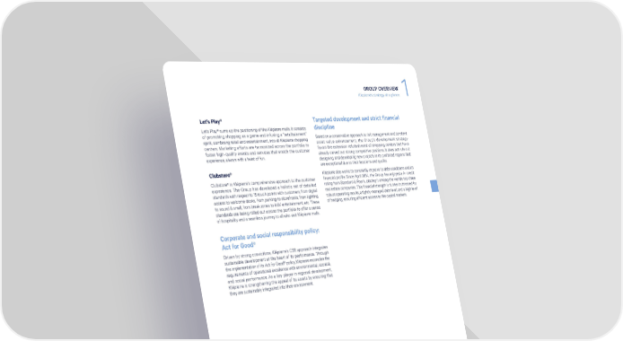 GROUP OVERVIEW Klépierre’s strategy at a glance 1 Let’s Play® Targeted development and strict financial Let’s Play® sums up the positioning of the Klépierre malls. It consists discipline of promoting shopping as a game and infusing a “retailtainment” Based on a conservative approach to risk management and constant spirit, combining retail and entertainment, into all Klépierre shopping asset value enhancement, the Group’s development strategy centers. Marketing efforts are harmonized across the portfolio to favors the extension-refurbishment of shopping centers that have foster high-quality events and services that enrich the customer already carved out strong competitive positions. It does not rule out experience, always with a twist of fun. designing and developing new projects in its preferred regions that are exceptional due to their locations and quality. Clubstore® Klépierre also works to constantly improve its debt conditions and its Clubstore® is Klépierre’s comprehensive approach to the customer financial profile. Since April 2014, the Group has enjoyed a A- credit experience. The Group has developed a holistic set of detailed rating from Standard & Poor’s, placing it among the world’s top three standards with respect to 15 touch points with customers, from digital real estate companies. This financial strength is further buttressed by access to welcome desks, from parking to storefronts, from lighting robust operating results, a tightly-managed debt level, and a high level to sound & smell, from break zones to kids’ entertainment, etc. These of hedging, ensuring efficient access to the capital markets. standards are being rolled out across the portfolio to offer a sense of hospitality and a seamless journey to all who visit Klépierre malls. Corporate and social responsibility policy: Act for Good® Driven by strong convictions, Klépierre’s CSR approach integrates sustainable development at the heart of its performance. Through the implementation of its Act for Good® policy, Klépierre reconciles the requirements of operational excellence with environmental, societal, and social performance. As a key player in regional development, Klépierre is strengthening the appeal of its assets by ensuring that they are sustainably integrated into their environment. KLÉPIERRE 2017 REGISTRATION DOCUMENT 5