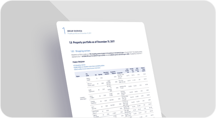 GROUP OVERVIEW 1 Property portfolio as of December 31, 2017 1.5 Property portfolio as of December 31, 2017 1.5.1 Shopping centers Klepierre’s portfolio is made up of 155 shopping centers located in 16 countries in Continental Europe, at the end of 2017. The shopping centers (1) (2) represent a GLA of 5,956,309 sq.m (vs 5,849,175 sq.m in 2016) included 4,405,133 sq.m (vs 4,307,323 sq.m in 2016) of Rentable floor Area (RFA) . France-Belgique 46 shopping centers €9,188 million in valuation total share excluding duties €394.9 million in net rental income total share Gross Rentable EPRA Klépierre City, Renovation/ Acquired by leasable floor vacancy equity Région center Dpt Opening extension Klépierre Composition area area rate interest Annecy, Monoprix, H&M, Courier 74 2001 2001 Zara, Fnac, 19,271 19,271 0.0% 58.4% 40 units Clermont- R 1990 Fnac, Zara, Ferrand, Jaude 63 1980 R/E 2008 1990 H&M, 134 units 41,113 41,113 1.1% 100.0% R/E 2013 R/E 1997 Écully, 69 1972 + R 2001 Carrefour, Zara, 39,968 13,452 0.0% 83.0% Grand Ouest (parking) 77 units 2009 Auvergne – Givors, R 1997 Carrefour, Rhône-Alpes 2 Vallées 69 1976 R 2016 2001 Castorama, 32,528 19,565 0.1% 83.0% 38 units Grenoble, Carrefour, H&M, Grand’Place 38 1976 R/E 2002 2015 Zara, Fnac, 80,573 54,893 10.6% 100.0% 117 units Riom, Carrefour, 63 Riom Sud 63 1992 R/E 2012 2012 units & retail 34,613 15,333 6.5% 50.0% park 4 units Saint-Étienne, 42 1979 2015 Auchan, H&M, 33,741 28,180 7.6% 100.0% Centre 2 C&A, 86 units Valence, 26 1994 R 2007 2007 Fnac, H&M, 10,434 10,434 7.8% 100.0% Victor Hugo Zara, 38 unités Britanny Rennes, 35 1986 E 2010 2005 Monoprix, Fnac, 21,291 16,467 0.6% 100.0% Colombia R 2016 H&M, 71 units Burgundy – Besançon, Monoprix, H&M, Franche-Comté Les Passages 25 2015 2015 Mango, 14,341 14,341 1.8% 100.0% Pasteur 22 units Centre – Chartres, 28 1967 2001 Carrefour, 22,239 7,115 0.0% 83.0% Val de Loire La Madeleine 20 units Grand Est Metz, 57 1975 R 2015 2015 Simply Market, 19,000 16,894 20.7% 100.0% Saint-Jacques H&M, 98 units Valenciennes, Carrefour Hauts-de-France Place d’Armes 59 2006 2006 Market, H&M, 15,740 15,740 0.8% 100.0% Zara, 54 units (1) Total sales area (including the hypermarket if there is one), plus storage area and not including aisles and shared tenant space. (2) Gross leasable area owned by Klépierre and on which Klépierre collects rents. 12 KLÉPIERRE 2017 REGISTRATION DOCUMENT