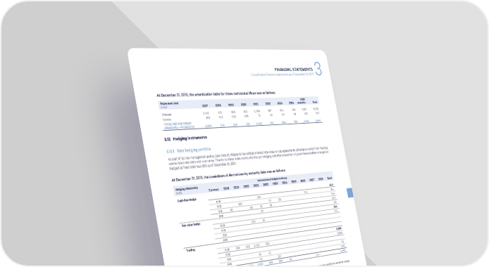 FINANCIAL STATEMENTS Consolidated financial statements as of December 31, 2017 3 At December 31, 2016, the amortization table for these contractual flows was as follows: Repayment year 2025 In €m 2017 2018 2019 2020 2021 2022 2023 2024 and after Total Principal 2,441 431 398 601 1,346 187 901 718 1,907 8,930 Interest 163 142 138 118 75 64 53 48 136 937 TOTAL FOR THE GROUP (PRINCIPAL + INTERESTS) 2,603 572 536 719 1,422 251 954 766 2,043 9,867 5.12 Hedging instruments 5.12.1 Rate hedging portfolio As part of its risk management policy (see note 8), Klépierre has settled interest rate swap or cap agreements allowing to switch from floating rate to fixed rate debt and vice-versa. Thanks to these instruments, the Group’s hedging rate (the proportion of gross financial debt arranged or hedged at fixed rate) was 95% as of December 31, 2017. At December 31, 2017, the breakdown of derivatives by maturity date was as follows: Hedging relationship Derivatives of Klépierre Group In €m Currency 2018 2019 2020 2021 2022 2023 2024 2025 2026 2027 2028 Total Cash-flow hedge 943 EUR 350 114 464 NOK 163 51 30 244 SEK 20 61 61 30 173 DKK 63 63 Fair value hedge 344 EUR 250 94 344 NOK SEK DKK Trading 3,099 EUR 700 410 1,450 300 2,860 NOK SEK 51 41 91 DKK 40 107 148 TOTAL FOR THE GROUP 720 573 1,852 908 189 30 114 4,386 The “trading” category includes a portfolio of caps (€1.34 billion of notional), a portfolio of €1.26 billion of payer swaps and one receiver swap maturing in 2020 for €400 million. At December 31, 2017, the corresponding contractual flows (interest) break down as follows (positive flows = payer flows): Hedging In €m relationship 2018 2019 2020 2021 2022 2023 2024 2025 2026 2027 2028 Total Swaps Cash-flow hedge 2 1 -0 -0 -0 -0 -1 -1 -1 0 Swaps Fair value hedge -17 -16 -7 -1 -42 Swaps/cap Trading -6 -8 16 -0 2 EUR-denominated derivatives -21 -23 8 -1 -0 -0 -1 -1 -1 -40 NOK-denominated derivatives 2 0 -0 -0 -0 -0 2 SEK-denominated derivatives 5 4 3 1 0 14 DKK-denominated derivatives 2 2 1 1 0 6 TOTAL FOR THE GROUP -12 -17 13 1 -0 -1 -1 -1 -1 -18 KLÉPIERRE 2017 REGISTRATION DOCUMENT 99