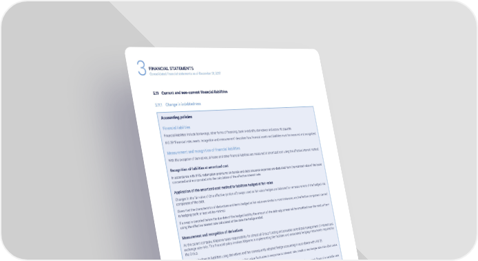 FINANCIAL STATEMENTS 3Consolidated financial statements as of December 31, 2017 5.11 Current and non-current financial liabilities 5.11.1 Change in indebtedness Accounting policies Financial liabilities Financial liabilities include borrowings, other forms of financing, bank overdrafts, derivatives and accounts payable. IAS 39 “Financial instruments: recognition and measurement” describes how financial assets and liabilities must be measured and recognized. Measurement and recognition of financial liabilities With the exception of derivatives, all loans and other financial liabilities are measured at amortized cost using the effective interest method. Recognition of liabilities at amortized cost In accordance with IFRS, redemption premiums on bonds and debt issuance expenses are deducted from the nominal value of the loans concerned and incorporated into the calculation of the effective interest rate. Application of the amortized cost method to liabilities hedged at fair value Changes in the fair value of (the effective portion of) swaps used as fair value hedges are balanced by remeasurement of the hedged risk component of the debt. Given that the characteristics of derivatives and items hedged at fair value are similar in most instances, any ineffective component carried to hedging profit or loss will be minimal. If a swap is canceled before the due date of the hedged liability, the amount of the debt adjustment will be amortized over the residual term using the effective interest rate calculated at the date the hedge ended. Measurement and recognition of derivatives As the parent company, Klépierre takes responsibility for almost all Group funding and provides centralized management of interest and exchange rate risks. This financial policy involves Klépierre in implementing the facilities and associated hedging instruments required by the Group. Klépierre hedges its liabilities using derivatives and has consequently adopted hedge accounting in accordance with IAS 39: > hedges to cover balance sheet items whose fair value fluctuates in response to interest rate, credit or exchange rate risks (fair value hedge); > hedges to cover the exposure to future cash flow risk (cash flow hedges), which consists of fixing future cash flows of a variable-rate liability or asset. The Klépierre portfolio meets all IAS 39 hedge definition and effectiveness criteria. The adoption of hedge accounting has the following consequences: > fair value hedges of existing assets and liabilities: the hedged portion of the asset/liability is accounted for at fair value in the balance sheet. The gains or losses resulting from changes in fair value are recognized immediately in profit or loss. At the same time, there is an opposite corresponding adjustment in the fair value of the hedging instrument, in line with its effectiveness; > cash flow hedges: the portion of the gain or loss on the fair value of the hedging instrument that is determined to be an effective hedge is recognized directly in equity and recycled to the income statement when the hedged cash transaction affects profit or loss. The gain or loss from the change in value of the ineffective portion of the hedging instrument is recognized immediately in profit or loss. Recognition date: trade or settlement IFRS aims at reflecting the time value of financial instruments as closely as possible by ensuring that, wherever possible, instruments with a deferred start date are recognized on the trade date, thus allowing calculation of the deferred start date. However, this principle cannot be applied to all financial instruments in the same way. For example, commercial paper is often renewed a few days before its due date. If these instruments were recognized at their trade date, this would artificially inflate the amount concerned between the renewal trade date of a paper and its effective start date. 94 KLÉPIERRE 2017 REGISTRATION DOCUMENT