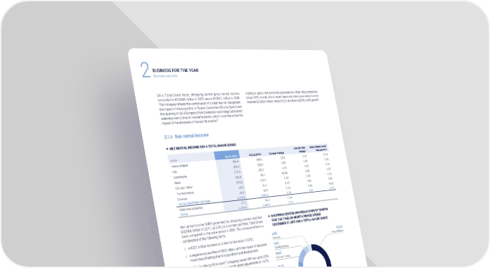 BUSINESS FOR THE YEAR 2Business overview On a Total-Share basis, shopping center gross rental income Adding in gross rental income generated by other retail properties amounted to €1,208.0 million in 2017, versus €1,183.4 million in 2016. (down 8.7%, mostly due to asset disposals), total gross rental income This increase reflects the combination of a solid like-for-like growth, reached €1,236.0 million, versus €1,214.0 million in 2016, a 1.8% growth. the impact of the acquisition of Nueva Condomina (Murcia, Spain), and the opening of Val d’Europe’s (Paris) extension and Hoog Catharijne’s redevelopment (Utrecht, the Netherlands), which more than offset the (1) impact of the disposals of the last 18 months . 2.1.4 Net rental income 3 NET RENTAL INCOME (ON A TOTAL-SHARE BASIS) Like-for-like Index-linked rental In €m 12/31/2017 12/31/2016 Current change change adjustments France-Belgium 394.9 388.0 1.8% 2.5% 0.1% Italy 195.2 189.8 2.8% 2.9% 0.3% Scandinavia 172.6 180.3 -4.3% 4.6% 2.4% Iberia 110.0 98.4 11.8% 6.8% 1.1% CEE and Turkey 113.8 110.1 3.4% 3.1% 1.1% The Netherlands 49.3 45.5 8.4% 2.1% 1.0% Germany 42.8 42.0 2.1% 0.1% 0.0% TOTAL SHOPPING CENTERS 1,078.6 1,054.1 2.3% 3.3% 0.7% Other retail properties 27.1 29.3 -7.5% TOTAL 1,105.6 1,083.4 2.1% Net rental income (NRI) generated by shopping centers reached 3 SHOPPING CENTER NRI BREAKDOWN BY REGION €1,078.6 million in 2017, up 2.3% on a current-portfolio, Total-Share FOR THE TWELVE-MONTH PERIOD ENDED basis compared to the same period in 2016. This increase reflects a DECEMBER 31, 2017 (ON A TOTAL-SHARE BASIS) combination of the following items: > a €32.5 million increase on a like-for-like basis (+3.3%); 4.0% 36.6% Germany France-Belgium > a negative scope effect of €8.0 million, with the impact of disposals 4.6% more than offsetting that of acquisitions and development. The Netherlands (2) 10.6% On a like-for-like portfolio basis , shopping center NRI was up by 3.3%, outperforming by 260 bps index-linked rental adjustments of +0.7%. CEE and Turkey 10.2% Iberia 16.0% 18.1% Scandinavia Italy (1) For more information, please refer to the “Investments, Developments and Disposals” section of this document. (2) Like-for-like excludes the contribution of new spaces (acquisitions, greenfield projects or extensions), spaces being restructured, disposals completed in 2017, and foreign exchange impacts. 44 KLÉPIERRE 2017 REGISTRATION DOCUMENT