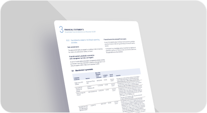 FINANCIAL STATEMENTS 3Consolidated financial statements as of December 31, 2017 9.3.2 Commitments related to the Group’s operating Financial warranties received from tenants activities As part of its rental business, the Group receives payment guarantees issued by financial institutions guaranteeing the amounts owed by Sale commitments tenants. The sale commitments are related to a building in Köln in Germany, To the best of our knowledge, we have not omitted any significant or four retail units and a land in Cahors, in France. potentially significant off-balance sheet commitment as defined by the applicable accounting standards. Financial warranty received in connection with management activity (Loi Hoguet) As part of its real-estate and property management activities, banking guarantees have been delivered to Klépierre Management for an amount capped at €190 million as of December 31, 2017. 9.4 Shareholders’ agreements Date of the agreement Companies or last % of group Type of (countries) Partners amendment control control Comments Bègles Arcins SCS Assurécureuil Pierre 09/02/2003 52.00% Exclusive The agreement contains provisions relating to the governance (France) 3 SC Control of the Company, and contains the usual protections found in proposed share sales, as well as a dispute resolution clause. Secovalde SCI, Vendôme 11/23/2010 55.00% Exclusive The agreement provides the usual protections in the event of Valdebac SCI Commerces SCI Control a proposed sale of equity shares to a third party (first refusal and (France) total joint exit rights) and change of control of a partner. Portes de Claye SCI Cardif Assurances vie 04/16/2012 55.00% Exclusive The agreement contains provisions governing relations between (France) Control Company partners. It provides the usual protections in the event of proposed sale of equity shares to third parties: reciprocal pre-emption right, reciprocal total joint exit right, total joint exit obligation by non-controlling partner in the event the majority partner plans to sell its full equity stake. It also gives minority partner a right of first offer in the event of a sale of assets by the Company. Massalia Invest SCI, Lacydon SA 09/27/2017 60.00% Exclusive The agreement contains provisions governing relationships Massalia Shopping Control between partners of the above companies, particularly the Mall SCI (France) corporate governance apparatus of Massalia Invest and Massalia Shopping Mall SCI, the terms of assignment and liquidity of investment of partners in Massalia Invest (right of first refusal, tag-along right, a change of control clause, option to purchase) and the terms and main methods of funding of Massalia Invest and Massalia Shopping Mall SCI. The last amendement is modifing the functionning rules (voting rules) of the executive committee when it comes to decisions related to the «grande surface alimentaire» of the shopping center. Nordica Holdco Stichting 10/07/2008 56.10% Exclusive The agreement includes the usual provisions to protect AB, Storm Holding Pensioenfonds ABP, Control non-controlling interests: qualified majority voting for certain Norway AS et Steen Storm ABP Holding decisions, purchase option in the event of deadlock and joint exit & Strøm AS (Sweden B.V. et PG Strategic rights, as well as the following provisions: & Norway) Real Estate Pool N.V., > a one-year inalienability period applied to Steen & Strøm Stichting Depositary shares from the date of acquisition; APG Real Estate > each party has a right of first offer on any shares which the Pool other party wishes to transfer to a third party, subject to the provision that if shares are transferred by one party (other than Klépierre or one of its affiliates) to a Klépierre competitor (as defined in the agreement), the shares concerned will be subject to a right of first refusal and not a right of first offer; > from the sixth year following acquisition, either party may request a meeting of shareholders to approve, subject to a two-thirds majority, the disposal of all the shares or assets of Steen & Strøm, or a market flotation of the Company. The Group has the right to appoint three members to the Board of Directors including the Chairman, whereas the partner can appoint two members. This latter has protective rights pursuant to the shareholders’ agreement and following the analysis of the decisions reserved for the partner. Kleprim’s SC (France) Holdprim’s SAS 11/30/2016 50.00% Joint The agreement gives Kléprojet 1 exit rights if the conditions Control precedent are unmet as well as the usual protections in the event of a proposed sale of equity shares to a third party (first refusal and total joint exit rights), change of control of a partner and other circumstances affecting the relationship between partners. Cecobil SCS (France) Vendôme 10/25/2007 50.00% Joint The agreement provides the usual protections in the event of Commerces SCI Control a proposed sale of equity shares to a third party (first refusal and total joint exit rights) and change of control of a partner. 112 KLÉPIERRE 2017 REGISTRATION DOCUMENT