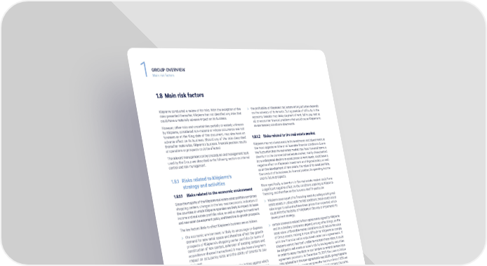 GROUP OVERVIEW 1 Main risk factors 1.8 Main risk factors Klépierre conducted a review of its risks. With the exception of the > the profitability of Klépierre’s real estate letting activities depends risks presented thereafter, Klépierre has not identified any risks that on the solvency of its tenants. During periods of difficulty in the could have a materially adverse impact on its business. economy, tenants may delay payment of rent, fail to pay rent at However, other risks and uncertainties partially or entirely unknown all, or encounter financial problems that would cause Klépierre to by Klépierre, considered non-material or whose occurrence was not review tenancy conditions downwards. foreseen as at the filing date of this document, may also have an adverse effect on its business. Should any of the risks described 1.8.1.2 Risks related to the real estate market thereafter materialize, Klépierre’s business, financial position, results Klépierre may not always execute its investments and divestments at at operations or prospects could be affected. the most opportune time or at favorable financial conditions due to The relevant management control procedures and management tools the fluctuation that the real estate market may face. In overall terms, a used by the Group are described in the following section on internal downturn in the commercial real estate market, mainly characterized control and risk management. by a widespread decline in asset prices or rent levels, could have a negative effect on Klépierre’s investment and disposal policy, as well as on the development of new assets, the value of its asset portfolio, 1.8.1 Risks related to Klépierre’s the conduct of its business, its financial position, its operating income strategy and activities and its future prospects. 1.8.1.1 Risks related to the economic environment More specifically, a downturn in the real estate market could have a significant negative effect on the conditions applying to Klépierre Since the majority of the Klépierre real estate asset portfolio comprises financing, and therefore on the business itself. In particular: shopping centers, changes in the key macroeconomic indicators of > Klépierre covers part of its financing needs by selling existing real the countries in which Klépierre operates are likely to impact its lease estate assets. In unfavorable market conditions, these assets could income and real estate portfolio value, as well as shape its investment take longer to sell and achieve lower prices than expected, which and new asset development policy, and therefore its growth prospects. could limit the flexibility of Klépierre in the way it implements its The key factors likely to affect Klépierre’s business are as follows: development strategy; > the economic environment is likely to encourage or depress > certain covenants related to loan agreements signed by Klépierre demand for new retail space and therefore affect the growth and its subsidiary companies depend, among other things, on the prospects of Klépierre’s shopping center portfolio (in terms of asset value. Unfavorable market conditions could reduce the value construction of new centers, extension of existing centers and of Group assets, making it more difficult for Klépierre to comply acquisition or disposal transactions). It may also have a long-term with the financial ratios stipulated under loan agreements. If impact on occupancy rates and the ability of tenants to pay Klépierre were to find itself unable to maintain these ratios, it could their rent; be obliged to sell assets or raise funds by issuing equity securities in order to repay the debt or ask lenders to amend certain loan > a downward trend or slower growth in the indices against which agreement provisions. At December 31, 2017, the Loan-to-Value most rents payable under Klépierre leases are indexed may also ratio referred to in the loan agreements was 36.8%, giving Klépierre compromise Klépierre’s rental income, as could any change in substantial room for maneuver given the maximum limit of 60% set the indices used for this purpose. The overall impact on all the in said agreements. Assuming the level of debt remains the same, leases in the Klépierre portfolio could be reduced by the fact that the value of the property portfolio would have to decline by more indexation is country specific (usually against national inflation than 39% to reach this limit. indices or, in the case of France, indices specific to commercial leases); 1.8.1.3 Risks related to the international operations > the ability of Klépierre to increase rents—or even to maintain of Klépierre’s business them at current levels—depends, at the point of lease renewal, principally on its tenants’ current and forecast revenue levels, Klépierre owns and operates shopping centers in 16 countries in which in turn depend in part on the state of the economy. Tenants’ continental Europe. Some of these countries may have risk profiles revenue trends also impact on the variable element of rents; higher than those of Klépierre’s major markets (France, Scandinavia, > any prolonged worsening of the macroeconomic situation of Italy). The economic and political context of these countries may be countries in which Klépierre’s portfolio is located, which would less stable, their regulatory frameworks and entry barriers may be less have a negative effect on Klépierre’s lease income and operating favorable and business conducted in local currencies that may prove income as a result of the loss of lease income and the increase in more volatile than the euro. The risks posed by individual countries, non-rebillable expenses (where vacant premises require repairs combined with a failure to manage those risks effectively, may have and renewals before they can be re-let, these costs cannot be an adverse impact on the operating income and financial position of passed on to tenants);