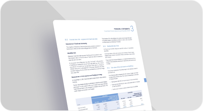 FINANCIAL STATEMENTS Consolidated financial statements as of December 31, 2017 3 8.1.2 Interest rate risk – exposure to fixed-rate debt The duration of fair value hedge instruments is never longer than that of the debt hedged, since Klépierre wishes to obtain a very high level Description of fixed-rate borrowing of effectiveness, as defined by IAS 32/39. The majority of Klépierre’s fixed-rate borrowing currently consists of 8.1.3 Marketable securities bonds (euro, NOK and SEK) and mortgage loans in Denmark. At December 31, 2017, Klépierre held €3.9 million of marketable Identified risk securities. Klépierre’s fixed-rate debt exposes the Group to fluctuations in risk- Cash equivalents refer only to amounts invested in French open- free interest rates, as the fair value of fixed-rate debt increases as ended money market funds (€3.8 million) and Italian treasury bills rates fall, and vice-versa. (€0.1 million). At any given time, Klépierre may also find itself in the position These investments expose Klépierre to a moderate interest rate risk as of needing to increase its future fixed-rate debt (e.g.: for a future a result of their temporary nature (cash investments) and the amounts acquisition). It would then be exposed to the risk of a change in involved. interest rate prior to arrangement of the loan. Klépierre may then consider hedging this risk, which may be treated as a cash flow hedge 8.1.4 Fair value of financial assets and liabilities risk under IFRS. The Group recognizes the borrowings in the balance sheet at Measurement of risk exposure and hedging strategy amortized cost. At December 31, 2017, fixed rate debt totaled €6,187 million before The following table compares the fair values of debts with their hedging. corresponding nominal values. Fair values are established on the basis of these principles: The fair value hedge strategy is calibrated to meet the overall hedging > floating bank debt: the fair value is equal to the nominal value; rate target. It is also based on the use of interest rate swaps allowing fixed-rate payments to be swapped to variable-rate payments. The > fixed-rate bank debt: the fair value is calculated solely on the basis credit margin component is not hedged. of rate fluctuations; > bonds: use of market quotations where these are available. 12/31/2017 12/31/2016 Change in fair value Change in fair value caused by a 1% increase caused by a 1% increase In €m Par value Fair value (a) Par value Fair value (a) in interest rate in interest rate Fixed-rate bonds 6,096.4 6,420.8 -276.7 5,725.8 6,005.1 -281.7 Fixed-rate bank loans 90.8 91.6 -0.7 117.6 118.6 -0.7 Other variable-rate loans 3,143.4 3,143.4 3,086.2 3,086.2 TOTAL 9,330.6 9,655.7 -277.4 8,929.7 9,209.9 -282.4 (a) Change in the fair value of the debt as a result of a parallel shift in the rate curve. Derivatives are recognized in the balance sheet at their fair value. At December 31, 2017, Klépierre has unused credit lines (including At December 31, 2017, a 100 basis point rise in rates would have bank overdrafts) totaling €1,770 million and €434 million available on resulted in a €37.5 million increase of in the value of the Group’s euro- its bank accounts. These resources are sufficient to absorb the main denominated interest rate derivatives. refinancing scheduled for the next two years. Generally speaking, access to finance for real estate companies 8.2 Liquidity risk is facilitated by the security offered to lenders in the form of the companies’ property assets. Klépierre is attentive to the long-term refinancing needs of its Some Klépierre sources of funding (bilateral loans, bonds, etc.) are business and the need to diversify maturity dates and the sources of accompanied by financial covenants which could lead to a mandatory finance in such a way as to facilitate renewals. prepayment of the debt. These covenants are based on the standard The average duration of indebtedness at December 31, 2017 was ratios applying to real estate companies, and the limits imposed 6.3 years, with borrowings spread between different markets (the leave Klépierre with sufficient flexibility. Failure to comply with these bond market and commercial papers represent 86%, with the balance covenants may result in mandatory prepayment. being raised in the banking market). Within the banking market, the Some of Klépierre SA bonds (€5,949 million) include a bearer put Company uses a range of different loans types (syndicated loans, option, providing the possibility of requesting early repayment in the mortgage loans, etc.) and counterparties. event of a change of control generating a change of Klépierre’s rating Outstanding commercial paper, which represents the bulk of short- to “non-investment grade”. Apart from this clause, no other financial term financing, never exceeds the backup lines. This means that the covenant refers to Standard & Poor’s rating for Klépierre. Company can refinance immediately if it has difficulty renewing its The main financial covenants are detailed in the financial report. borrowings on the commercial paper market. KLÉPIERRE 2017 REGISTRATION DOCUMENT 109