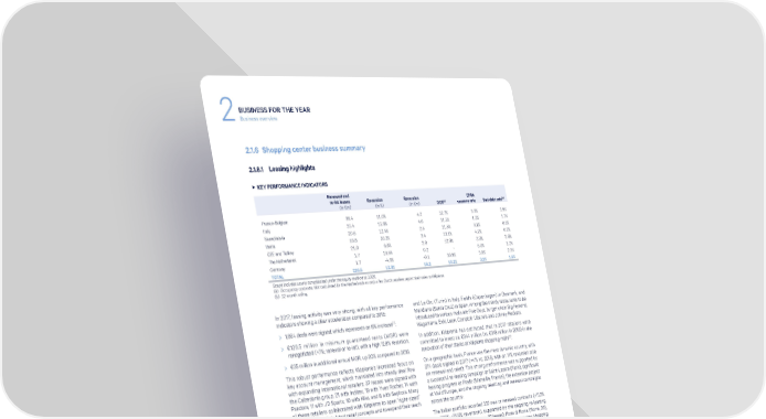BUSINESS FOR THE YEAR 2Business overview 2.1.6 Shopping center business summary 2.1.6.1 Leasing highlights 3 KEY PERFORMANCE INDICATORS Renewed and re-let leases Reversion Reversion EPRA (a) (b) (in €m) (in %) (in €m) OCR vacancy rate Bad debt rate France-Belgium 38.4 11.0% 4.2 12.7% 3.3% 1.9% Italy 25.4 15.8% 4.0 11.5% 1.2% 1.7% Scandinavia 20.6 12.4% 2.5 11.5% 3.1% 0.1% Iberia 16.8 20.2% 3.4 13.1% 4.2% 0.2% CEE and Turkey 21.9 8.9% 2.0 12.9% 3.9% 2.6% The Netherlands 1.7 13.5% 0.2 - 6.0% 1.2% Germany 1.7 -4.6% -0.1 10.9% 5.9% 2.3% TOTAL 126.5 12.9% 16.2 12.2% 3.2% 1.5% Scope includes assets consolidated under the equity method at 100%. (a) Occupancy cost ratio. Not calculated for the Netherlands as only a few Dutch retailers report their sales to Klépierre. (b) 12-month rolling. In 2017, leasing activity was very strong, with all key performance and Le Gru (Turin) in Italy, Field’s (Copenhagen) in Denmark, and indicators showing a clear acceleration compared to 2016: Meridiano (Santa Cruz) in Spain. Among the trendy restaurants to be (1) introduced to various malls are Five Guys, burger chain Big Fernand, > 1,864 deals were signed, which represents an 8% increase ; Wagamama, Exki, Leon, Comptoir Libanais and Johnny Rockets. > €126.5 million in minimum guaranteed rents (MGR) were In addition, Klépierre has estimated that in 2017 retailers were renegotiated (+7%; renewal or re-let), with a high 12.9% reversion; committed to invest ca. €344 million (vs. €318 million in 2016) in the (2) > €35 million in additional annual MGR, up 20% compared to 2016. renovation of their stores at Klépierre shopping malls . This robust performance reflects Klépierre’s increased focus on On a geographic basis, France was the most dynamic country, with key account management, which translated into steady deal flow 374 deals signed in 2017 (+4% vs. 2016; with an 11% reversion rate with expanding international retailers: 37 leases were signed with on renewal and relet). This strong performance was supported by the Calzedonia group, 21 with Inditex, 19 with Yves Rocher, 14 with a successful re-leasing campaign at Saint-Lazare (Paris), significant Pandora, 11 with JD Sports, 10 with Kiko, and 8 with Sephora. Many leasing progress at Prado (Marseille, France), the extension project of these retailers collaborated with Klépierre to open “right-sized” at Val d’Europe, and the ongoing reletting and renewal campaigns stores featuring their latest retail concepts and to expand their reach across the country. throughout Europe. The Italian portfolio recorded 337 new or renewed contracts (+11.2% Last but not least, Klépierre remained extremely active in rolling vs. 2016; +15.8% reversion), supported by the ongoing re-leasing out its Destination Food® concept. With food & beverage retailer campaigns at Globo (Busnago, 27 leases), Porta di Roma (Rome, 26), sales growing twice as fast as total retailer sales at Klépierre malls Campania (Naples, 19), Il Leone (Lonato, 19), and Romagna Shopping since 2013, this approach enriches the retail mix through a more Valley (Emilia-Romagna region, 17). innovative and expanded food offering, which ultimately contributes to Lastly, leasing activity remained buoyant in Iberia, with 321 deals increased footfall, dwell time and retailer sales. In 2017, the Destination (+21.1% versus 2016) posting record high reversion of 20.2%. These Food® concept was notably implemented at Val d’Europe in France, performances reflect the economic recovery of Spain and Portugal Hoog Catharijne (Utrecht) in the Netherlands, Campania (Naples) and the quality of Klépierre’s portfolio. (1) In 2017, Klépierre discontinued the separate counting of storage unit leases in Scandinavia for harmonization purposes; 2016 figures have been restated accordingly. (2) Estimated amount based on a representative sample of leases signed in 2017 and extrapolated for the entire portfolio. Investment may be spread-out over several years. 46 KLÉPIERRE 2017 REGISTRATION DOCUMENT