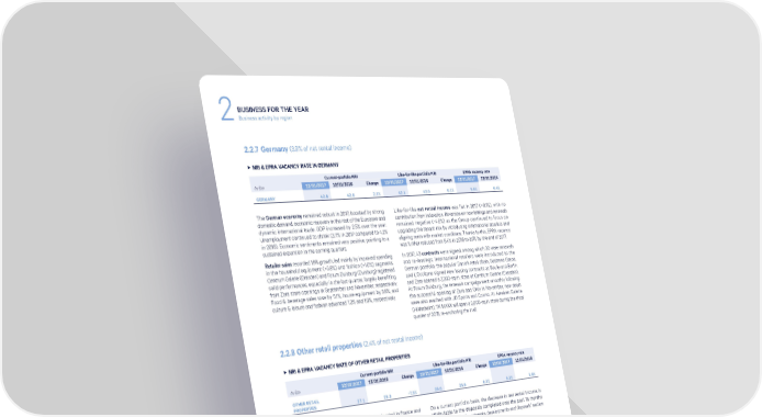 BUSINESS FOR THE YEAR 2Business activity by region 2.2.7 Germany (3.9% of net rental income) 3 NRI & EPRA VACANCY RATE IN GERMANY Current-porfolio NRI Like-for-like portfolio NRI EPRA vacancy rate In €m 12/31/2017 12/31/2016 Change 12/31/2017 12/31/2016 Change 12/31/2017 12/31/2016 GERMANY 42.8 42.0 2.1% 42.1 42.0 0.1% 5.9% 6.4% The German economy remained robust in 2017, boosted by strong Like-for-like net rental income was flat in 2017 (+0.1%), with no domestic demand, economic recovery in the rest of the Eurozone and contribution from indexation. Reversion on new lettings and renewals dynamic international trade. GDP increased by 2.5% over the year. remained negative (-4.6%) as the Group continued to focus on Unemployment continued to shrink (3.7% in 2017 compared to 4.2% upgrading the tenant mix by introducing international retailers and in 2016). Economic sentiments remained very positive, pointing to a aligning rents with market conditions. Thanks to this, EPRA vacancy sustained expansion in the coming quarters. was further reduced from 6.4% in 2016 to 5.9% by the end of 2017. Retailer sales recorded 1.9% growth, led mainly by improved spending In 2017, 43 contracts were signed, among which 30 were renewals in the household equipment (+3.8%) and fashion (+1.0%) segments. and re-leasings. International retailers were introduced to the Centrum Galerie (Dresden) and Forum Duisburg (Duisburg) registered German portfolio: the popular Danish retail chain, Søstrene Grene, solid performances, especially in the last quarter, largely benefiting and L’Occitane signed new leasing contracts at Boulevard Berlin from Zara store openings in September and November, respectively. and Zara opened a 3,300-sq.m. store at Centrum Galerie (Dresden). Food & beverage sales rose by 5.1%, house equipment by 3.8%, and At Forum Duisburg, the renewals campaign went smoothly following culture & leisure and fashion advanced 1.3% and 1.0%, respectively. the successful opening of Zara and Only in November, new deals were also reached with JD Sports and Cosmo. At Arneken Galerie (Hildesheim), TK MAXX will open a 2,000-sq.m. store during the third quarter of 2018, re-anchoring the mall. 2.2.8 Other retail properties (2.4% of net rental income) 3 NRI & EPRA VACANCY RATE OF OTHER RETAIL PROPERTIES Current-porfolio NRI Like-for-like portfolio NRI EPRA vacancy rate In €m 12/31/2017 12/31/2016 Change 12/31/2017 12/31/2016 Change 12/31/2017 12/31/2016 OTHER RETAIL PROPERTIES 27.1 29.3 -7.5% 26.0 25.9 0.2% 5.2% 2.6% This segment refers to standalone retail units located in France and On a current portfolio basis, the decrease in net rental income is mostly in the vicinity of large regional retail destinations. attributable to the disposals completed over the past 18 months (please refer to the “Investments, developments and disposals” section in this document). 52 KLÉPIERRE 2017 REGISTRATION DOCUMENT