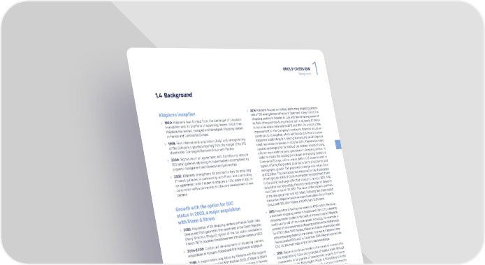 GROUP OVERVIEW Background 1 1.4 Background Klépierre inception > 2014: Klépierre focuses on its best-performing shopping centers: sale of 126 retail galleries in France, in Spain and in Italy in April, five > 1990: Klépierre was formed from the demerger of Locabail- shopping centers in Sweden in July, and the remaining assets of Immobilier and its portfolio of operating leases. Since then, its Paris office portfolio during the first half. In all, nearly €3 billion Klépierre has owned, managed and developed shopping centers in non-core assets were sold in 2013 and 2014. As a result of the in France and Continental Europe. improvement of the Company’s profile, its financial structure > 1998: First international acquisition (Italy) and strengthening continued to strengthen, which led Standard & Poor’s to raise of the Company’s position resulting from the merger of its 51% Klépierre’s credit rating to A, placing it among the world’s top four shareholder, Compagnie Bancaire Group, with Paribas. rated real estate companies. In October 2014, Klépierre launched a public exchange offer for 100% of the ordinary shares of Corio, > 2000: Signature of an agreement with Carrefour to acquire a Dutch real estate company specialized in shopping centers, in 160 retail galleries adjoining its hypermarkets accompanied by order to create the leading pure player in shopping centers in property management and development partnerships. Continental Europe, with a unique platform of assets located in > 2002: Klépierre strengthens its position in Italy by acquiring regions offering the greatest potential in terms of economic and 11 retail galleries in partnership with Finim and concluding demographic growth. The proposed exchange ratio values Corio an agreement with Finiper to acquire a 40% stake in IGC in at €7.2 billion. This transaction was welcomed by the shareholders conjunction with a partnership for the joint development of new of both groups: 93.6% of Corio shareholders tendered their shares centers. in the public exchange offer that closed in January 2015. This acquisition was followed by the cross-border merger of Klépierre and Corio on March 31, 2015. The value of the property portfolio Growth with the option for SIIC of the new group was over €21 billion. Following this share-based transaction, Klépierre had three main shareholders: Simon Property status in 2003, a major acquisition Group with 18%, BNP Paribas and APG with 13.5% each. with Steen & Strøm > 2015: Acquisition of two top-tier assets for €720 million: Plenilunio, > 2003: Acquisition of 28 shopping centers in France, Spain, Italy, a dominant shopping center in Madrid and Oslo City, a leading Greece and Portugal and its first investment in the Czech Republic shopping center located in the heart of Norway’s capital. Klépierre (Nový Smíchov, Prague); option of the tax status available to continued to sell off non-core assets including, for example, a French REITs (sociétés d’investissement immobilier cotées or SIIC). portfolio of nine convenience shopping centers in the Netherlands for €730 million. BNP Paribas, Klépierre’s historic shareholder, sells > 2004-2006: Continued development of shopping centers, off its remaining shares on the market. As a result, Klépierre’s free- acquisitions in Hungary, Poland and first investment in Belgium. float exceeded 65% and, in December 2015, Klépierre joined the > 2008: A major historic acquisition by Klépierre with the support CAC 40, the main index of the Paris stock exchange. of its majority shareholder BNP Paribas: 56.1% of Steen & Strøm > 2016: Klépierre continues to ride on the waves of success after (shopping center real estate company with operations in Norway, the integration of Corio and synergies at various levels through Sweden and Denmark) in partnership with the Netherlands-based investments in its pipeline of development projects (in France: APG Pension Fund (43.9%). Val d’Europe in the Paris region, Prado in Marseille and in the > 2011: Ongoing development including among other things the Netherlands with Hoog Catharijne) with a focus on extensions opening of the Millénaire (Paris region) and the acquisition of offering more visibility. Through the disposal of close to Roques (Toulouse, France). €600 million in assets, Klépierre keeps on improving the average quality of its portfolio. > 2017: saw two emblematic openings of extension projects of Since 2012: 100% retail real estate strategy Klepierre. In April, 17 years after its establishment, Val d’Europe and creation of the leading European pure was extended over another 17,000 m², welcoming 30 new brands, including Primark, Uniqlo, Nike and NYX. In addition, the first play shopping center specialist phase of Hoog Catharijne redevelopment’s opening has confirmed > 2012-2013: Consolidation of the strategy as a pure player in its leading position as the most visited shopping center in the shopping centers in Continental Europe: disposal program of Netherlands (with 26 million visitors in 2017, up 10,5%). In May, mature assets and start of divestment from the office property Klépierre reinforced its position in Spain with the acquisition of segment for nearly €1.3 billion, and delivery of landmark Nueva Condomina, the leading shopping center in Murcia region. development projects including Saint-Lazare Paris (France) and At the same time, Klepierre disposed a total of €263 million assets, Emporia (Malmö, Sweden). Early 2012: Simon Property Group, mostly in Scandinavia, Spain and France. an American group and a world leader in the shopping center industry, acquires a 28% equity stake in Klépierre. BNP Paribas becomes the second largest shareholder with a 22% equity stake. KLÉPIERRE 2017 REGISTRATION DOCUMENT 11