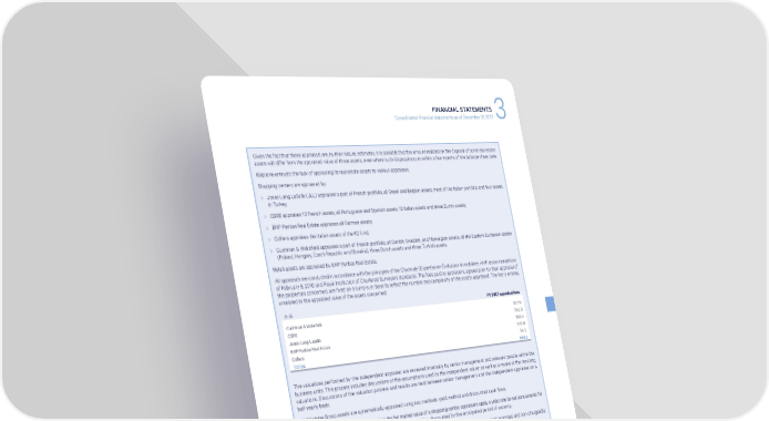 FINANCIAL STATEMENTS Consolidated financial statements as of December 31, 2017 3 Given the fact that these appraisals are, by their nature, estimates, it is possible that the amount realized on the disposal of some real estate assets will differ from the appraised value of those assets, even where such disposal occurs within a few months of the balance sheet date. Klépierre entrusts the task of appraising its real estate assets to various appraisers. Shopping centers are appraised by: > Jones Lang LaSalle (JLL) appraises a part of French portfolio, all Greek and Belgian assets, most of the Italian portfolio and four assets in Turkey; > CBRE appraises 10 French assets, all Portuguese and Spanish assets, 12 Italian assets and three Dutch assets; > BNP Paribas Real Estate appraises all German assets; > Colliers appraises the Italian assets of the K2 fund; > Cushman & Wakefield appraises a part of French portfolio, all Danish, Swedish, and Norwegian assets, all the Eastern European assets (Poland, Hungary, Czech Republic and Slovakia), three Dutch assets and three Turkish assets. Retail assets are appraised by BNP Paribas Real Estate. All appraisals are conducted in accordance with the principles of the Charte de l’Expertise en Évaluation Immobilière, AMF recommendations of February 8, 2010 and Royal Institution of Chartered Surveyors standards. The fees paid to appraisers, agreed prior to their appraisal of the properties concerned, are fixed on a lump sum basis to reflect the number and complexity of the assets appraised. The fee is entirely unrelated to the appraised value of the assets concerned. In €k FY 2017 appraisal fees Cushman & Wakefield 307.9 CBRE 241.0 Jones Lang Lasalle 283.4 BNP Paribas Real Estate 122.8 Colliers 14.1 TOTAL 969.1 The valuations performed by the independent appraiser are reviewed internally by senior management and relevant people within the business units. This process includes discussions of the assumptions used by the independent valuer, as well as a review of the resulting valuations. Discussions of the valuation process and results are held between senior management and the independent appraiser on a half-yearly basis. All Klépierre Group assets are systematically appraised using two methods: yield method and discounted cash flows. According to the yield method, to determine the fair market value of a shopping center, appraisers apply a yield rate to net annual rents for occupied premises, and to the net market rent for vacant properties, discounted for the anticipated period of vacancy. The present value of rebates on minimum guaranteed rent payments, expenses payable on currently vacant premises and non-chargeable work is then deducted from the fair market value calculated above. A standard vacancy rate is then defined for each asset. The discount rate applied is the same as the yield rate used in the fair market value calculation. Gross rent includes the minimum guaranteed rent, the variable part of the rent and the market rental price for vacant properties. The net total rent is calculated by deducting the following expenses from the gross rent: management charges, non-reinvoiced charges, expenses relating to provisions for vacant premises and the average loss on bad debts over the previous five years. The yield rate is set by the appraiser based on a range of parameters, the most important of which are: retail sales area, layout, competition, type and percentage of ownership, gross rental income and extension potential and comparability with recent transactions in the market. The discounted cash flows method calculates the value of an asset as the sum of discounted future cash flows based on a discount rate defined by the appraiser. The appraiser estimates anticipated total revenues and expenses relating to the asset, and then measures a “terminal value” at the end of an average ten-year analytical period. By comparing the market rental values with face rental values, the appraiser assesses the reversion potential of the asset, using the market rental value at the end of the lease, after deduction of the expenses incurred in remarketing the property. Lastly the appraiser discounts the forecast cash flow to determine the present value of the property. The discount rate adopted reflects the market risk-free rate (ten-year government bond) plus a property market risk and liquidity premium and an asset-specific premium reflecting the location, specification and tenancy of each building. KLÉPIERRE 2017 REGISTRATION DOCUMENT 87
